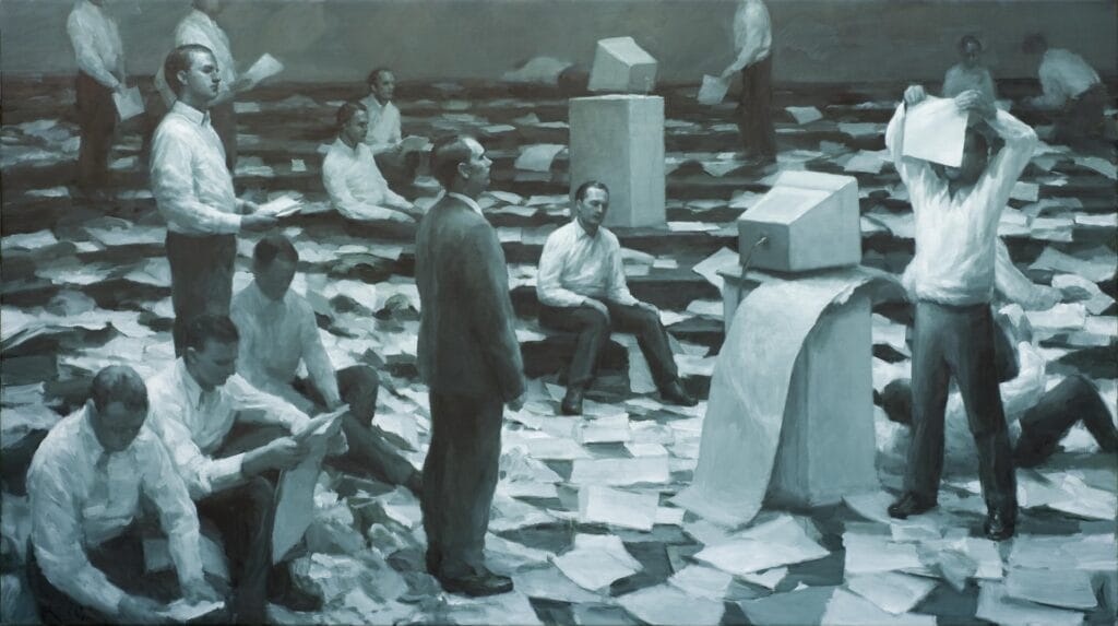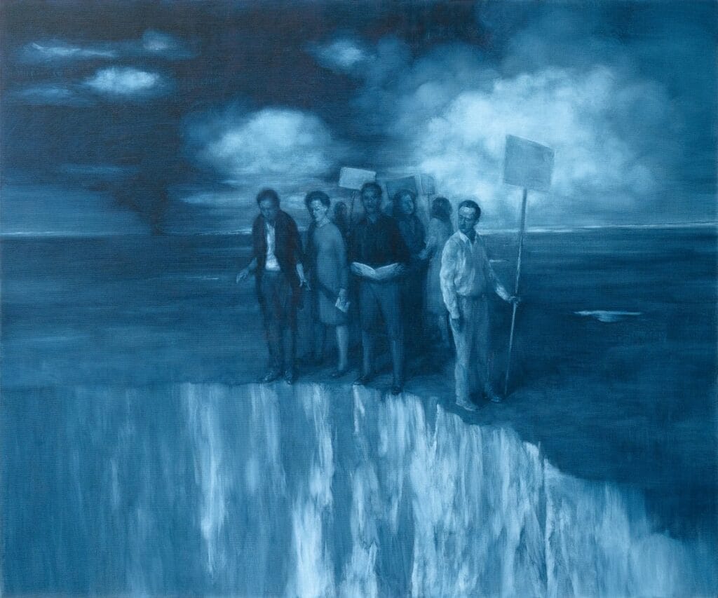 C’est peut-être là que réside la grande différence avec la peinture d’histoire. Les artistes significatifs de ce genre ancien s’efforçaient de donner à leurs personnages des expressions en rapport avec la situation représentée. Dans Le Radeau de la Méduse, Géricault montre des naufragés dont les visages et les gestes trahissent l’abattement, l’espoir ou la rage de survivre. Au contraire, dans The Transportation, Martensen représente une vingtaine de personnes rangées dans une barque au milieu de nulle part et en route pour une destination inconnue. Les passagers semblent aussi indifférents à leur sort que s’ils étaient assis dans une salle de cinéma. Ils ne projettent rien dans leur environnement. Au contraire, c’est le monde qui les pénètre. Toute la puissance de cette nouvelle forme de la peinture d’histoire est qu’elle est, en fin de compte, moins événementielle et plus existentielle.