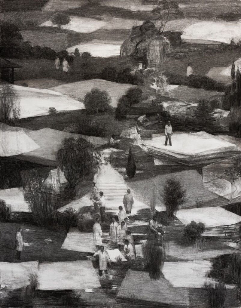 La peinture Wet Place , elle aussi en noir et blanc, lui aurait été inspirée par les djihadistes et leur croyance selon laquelle 72 vierges les attendraient au paradis. Cependant, l’auteur se garde bien de faire référence à quoi que ce soit d’islamique, préférant donner à son œuvre une portée générale. L’au-delà dont il est question est un vaste sous-sol inondé, un parking désaffecté où des clones de femmes patientent en blouse blanche, adossés aux piliers. Les hommes ont bien besoin d’infirmières, en effet, pour se guérir de leurs idéalismes mortifères. Les guerriers défunts (plus difficiles à déceler dans le haut de la composition) restent scotchés au plafond comme de pauvres ectoplasmes, incapables d’aller rejoindre les femmes promises. C’est une punition logique.